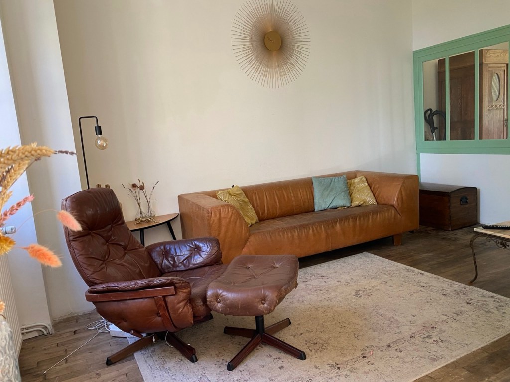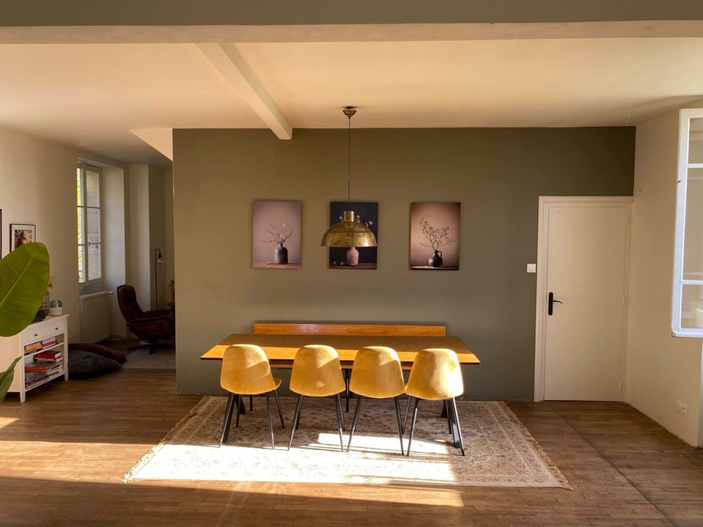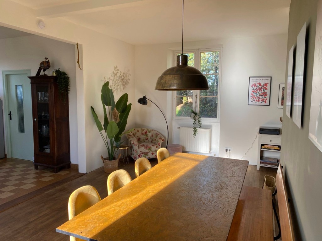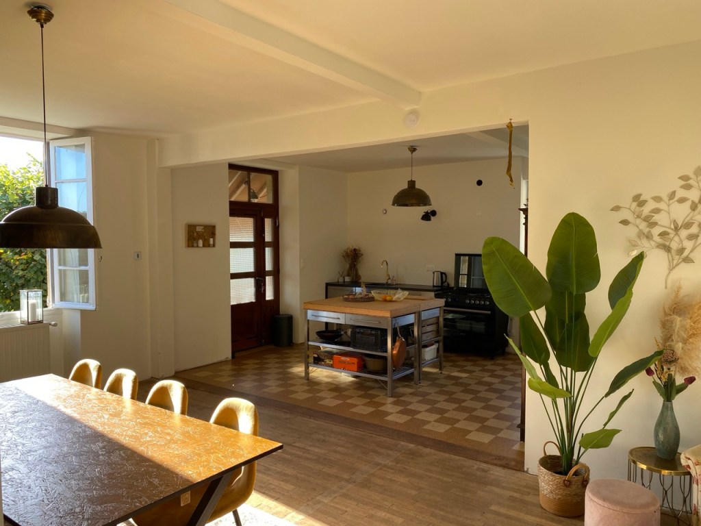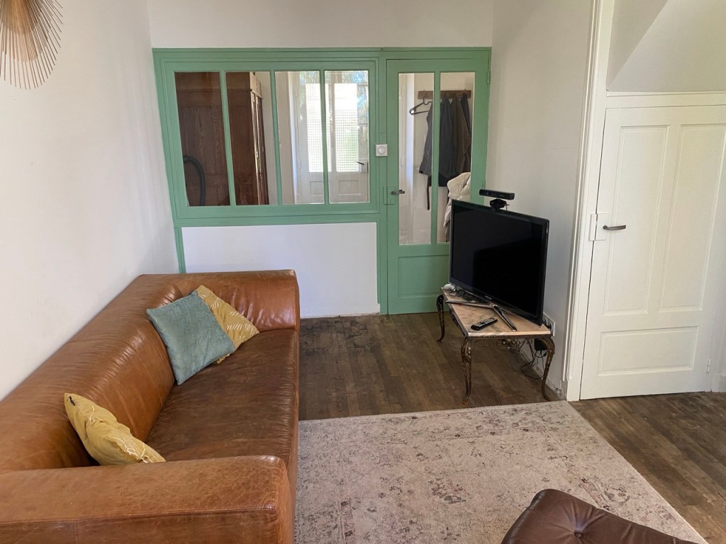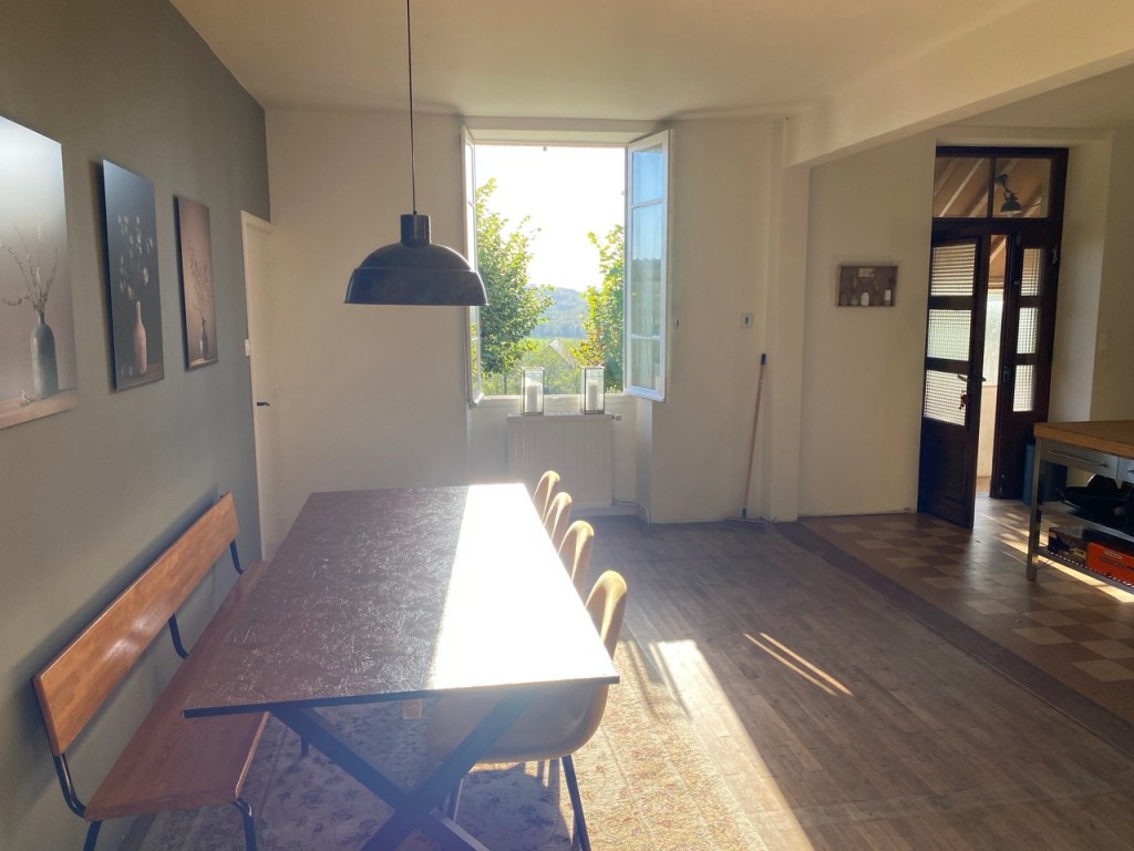 Vanuit de open keuken staat centraal een 3 meter lange tafel waaraan een grote groep lekker kan dineren of spelletjes spelen. In dezelfde ruimte bevindt zich ook een knus zitje waarin je even rustig een boek kan lezen. Achter de muur van de eettafel is de TV kamer waar TV gekeken kan worden. Door met de wifi te verbinden kan alles gestreamd worden via de Google Chromecast.